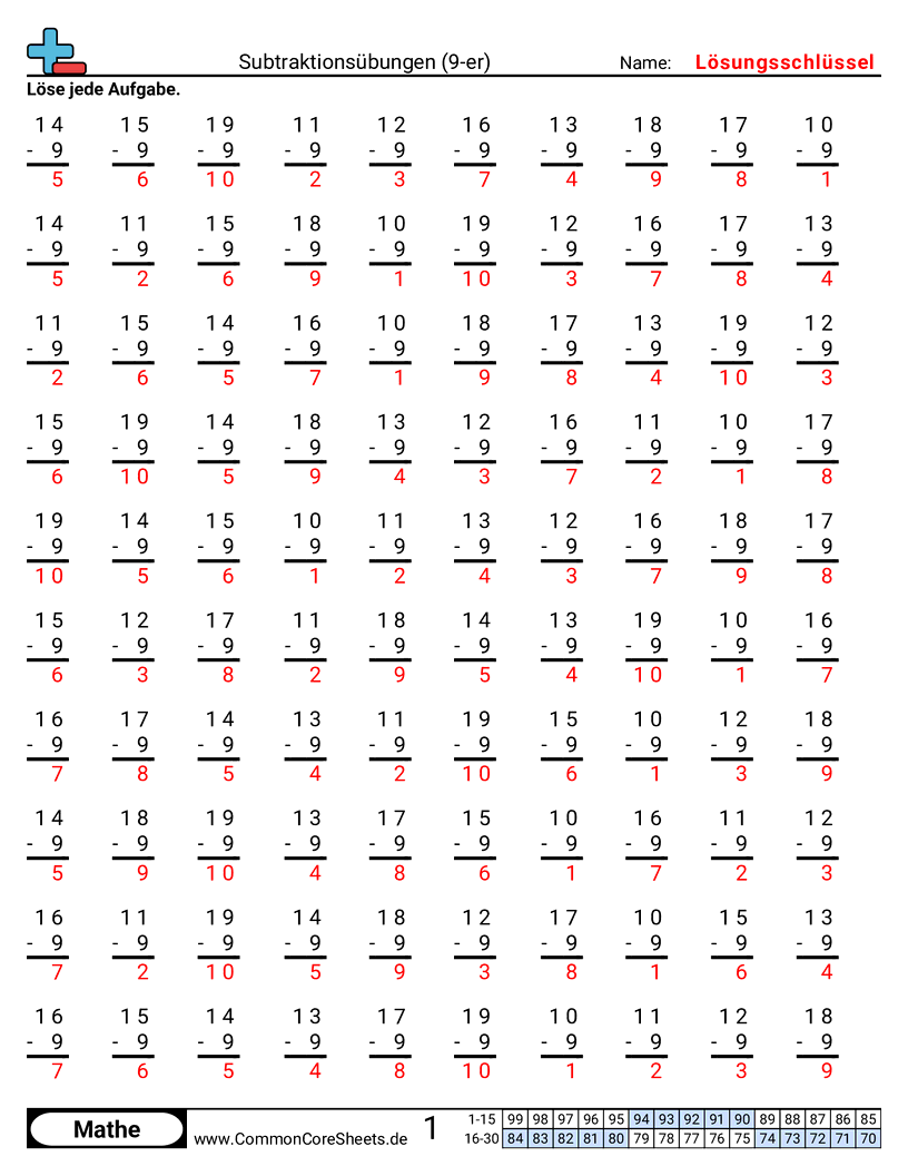 Jedes Arbeitsblatt hat 100 Aufgaben, wo die Zahl 9 von einer Zahl subtrahiert wird.