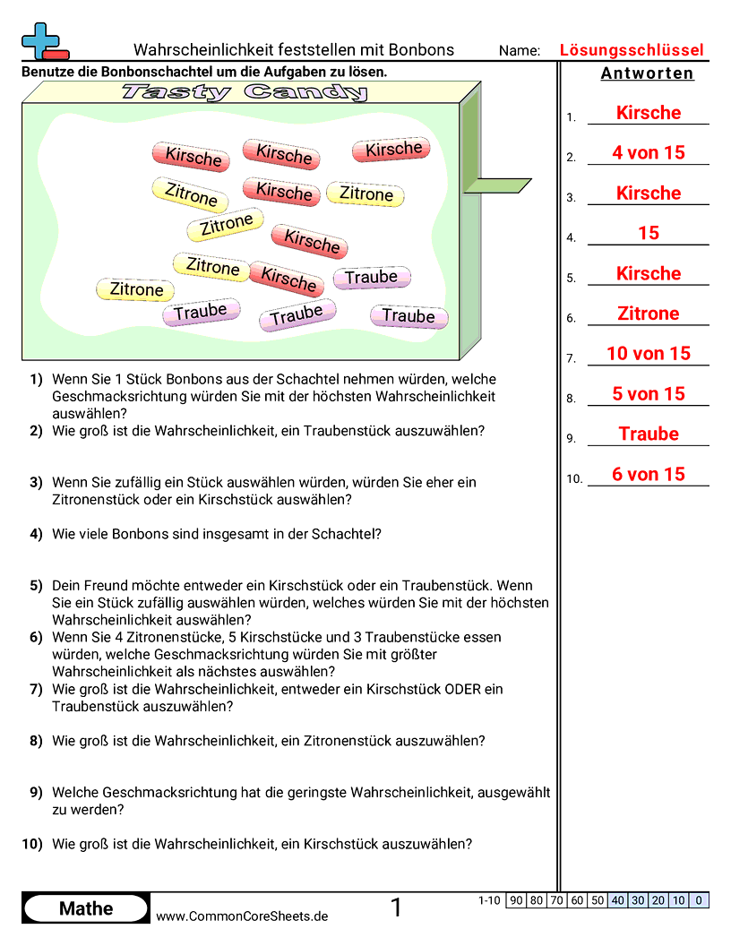 Kostenlose math-Arbeitsblätter zu Wahrscheinlichkeit feststellen mit Bonbons. Jedes Arbeitsblatt enthält 10 Aufgaben mit Lösungsschlüssel und ist ideal für Lehrkräfte und Homeschooling. Sie können das PDF herunterladen, Karteikarten erstellen oder es für Online-Lernen nutzen.