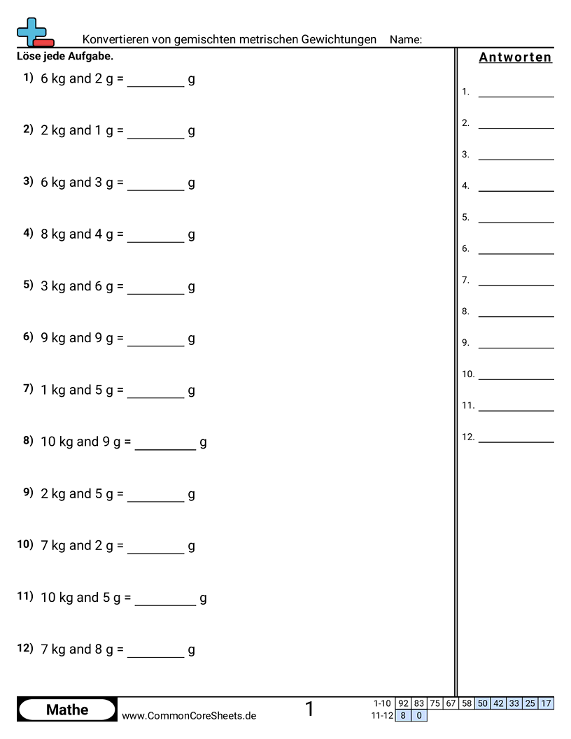 Kostenlose math-Arbeitsblätter zu Konvertieren von gemischten metrischen Gewichtungen. Jedes Arbeitsblatt enthält 12 Aufgaben mit Lösungsschlüssel und ist ideal für Lehrkräfte und Homeschooling. Sie können das PDF herunterladen, Karteikarten erstellen oder es für Online-Lernen nutzen.