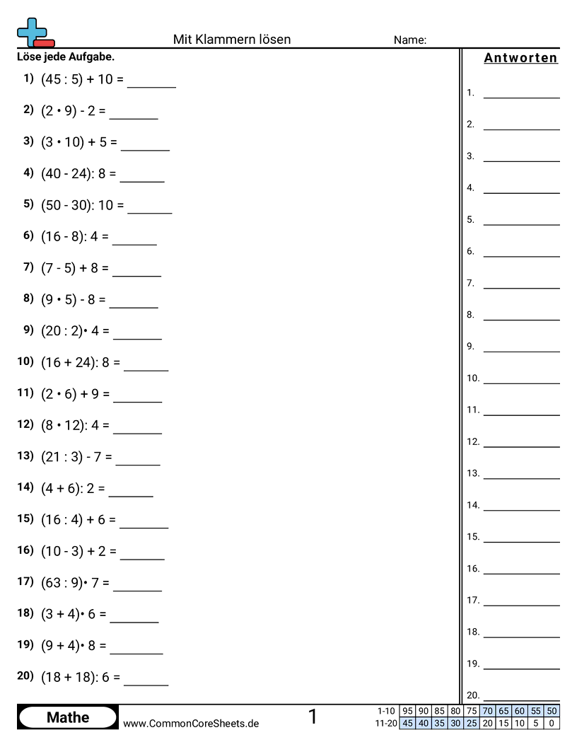 Kostenlose math-Arbeitsblätter für 5. Klasse (5oa1) zu Mit Klammern lösen. Jedes Arbeitsblatt enthält 20 Aufgaben mit Lösungsschlüssel und ist ideal für Lehrkräfte und Homeschooling. Sie können das PDF herunterladen, Karteikarten erstellen oder es für Online-Lernen nutzen.