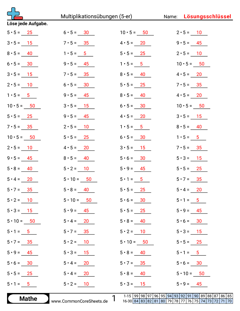 Kostenlose math-Arbeitsblätter zu Multiplikationsübungen (5-er). Jedes Arbeitsblatt enthält 100 Aufgaben mit Lösungsschlüssel und ist ideal für Lehrkräfte und Homeschooling. Sie können das PDF herunterladen, Karteikarten erstellen oder es für Online-Lernen nutzen.