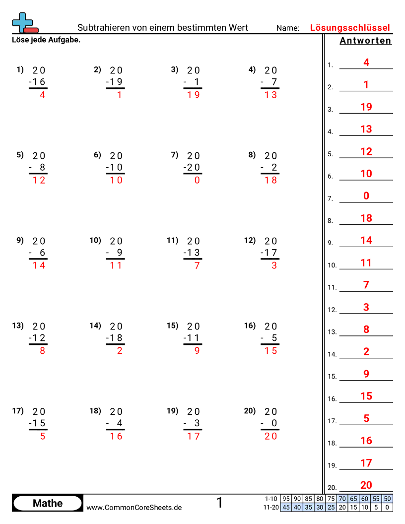Kostenlose math-Arbeitsblätter zu Subtrahieren von einem bestimmten Wert. Jedes Arbeitsblatt enthält 20 Aufgaben mit Lösungsschlüssel und ist ideal für Lehrkräfte und Homeschooling. Sie können das PDF herunterladen, Karteikarten erstellen oder es für Online-Lernen nutzen.