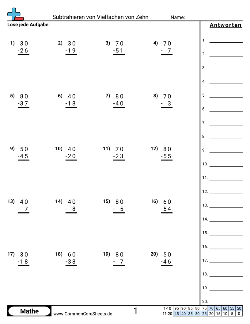 Kostenlose math-Arbeitsblätter zu Subtrahieren von Vielfachen von Zehn. Jedes Arbeitsblatt enthält 20 Aufgaben mit Lösungsschlüssel und ist ideal für Lehrkräfte und Homeschooling. Sie können das PDF herunterladen, Karteikarten erstellen oder es für Online-Lernen nutzen.