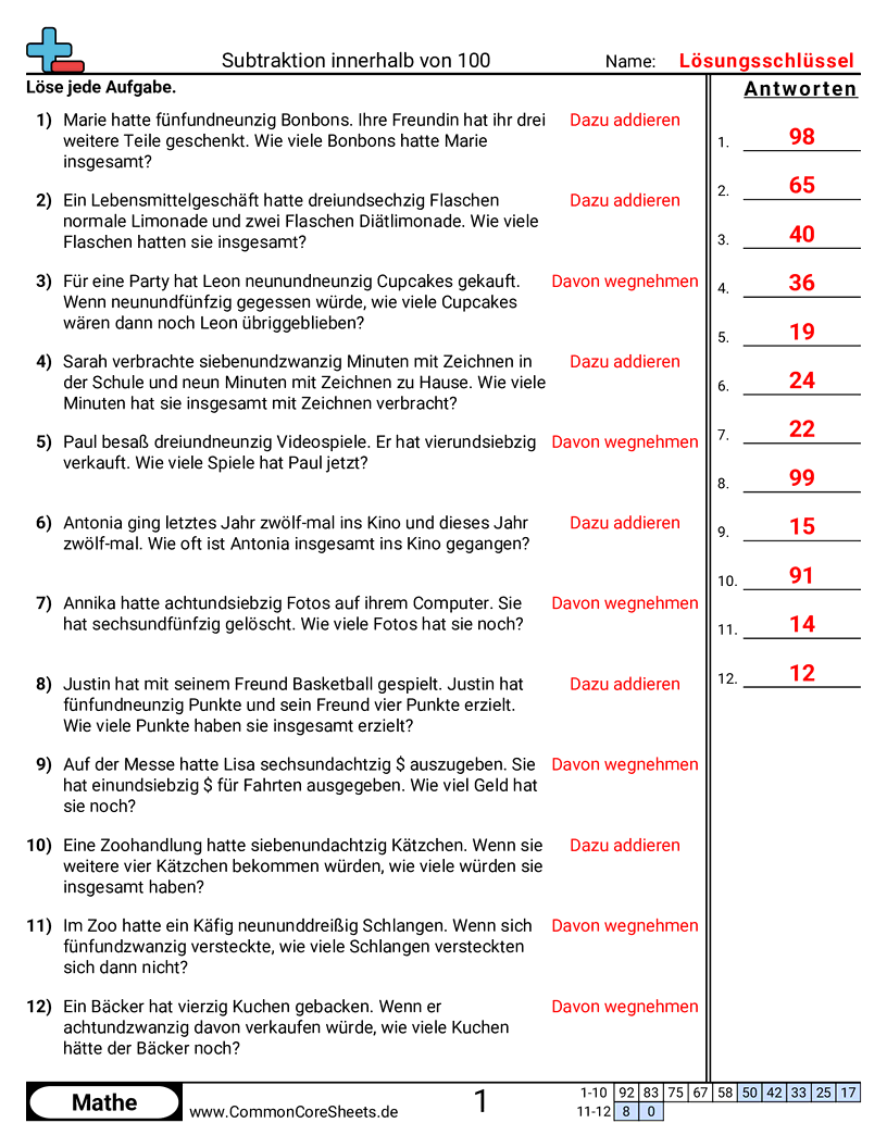 Sachaufgaben zur Subtraktion im Zahlenraum bis 100