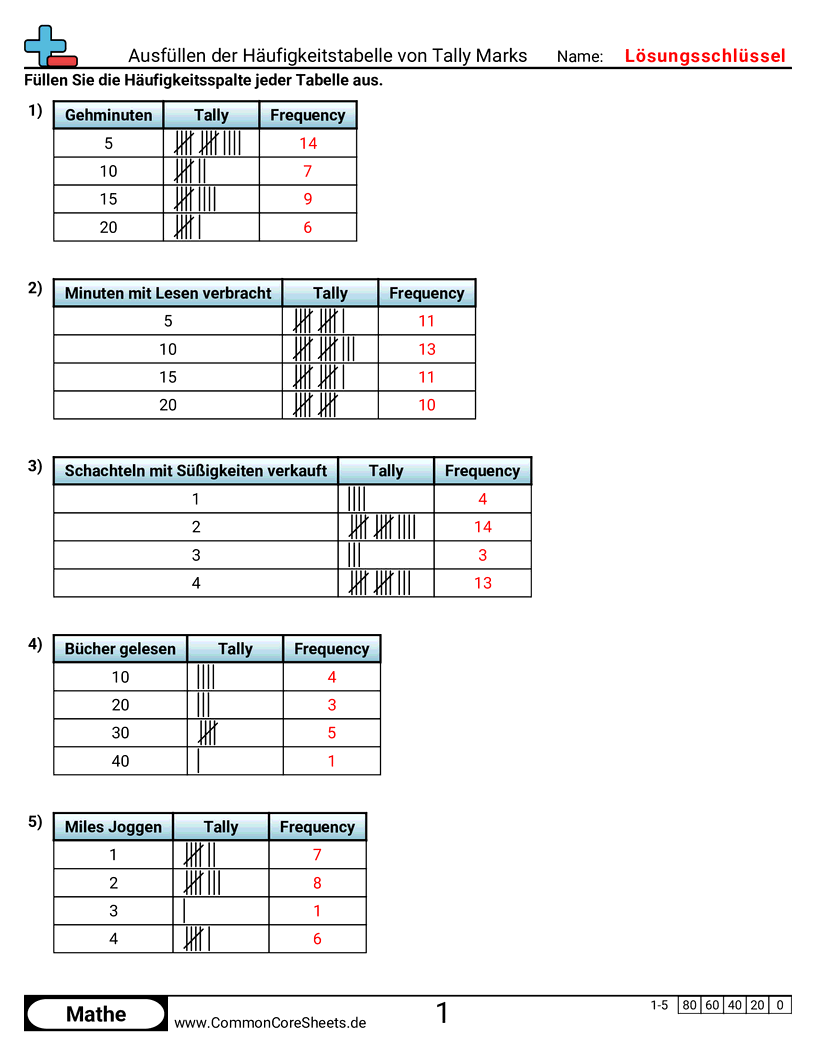 Kostenlose math-Arbeitsblätter zu Ausfüllen der Häufigkeitstabelle von Tally Marks. Jedes Arbeitsblatt enthält 5 Aufgaben mit Lösungsschlüssel und ist ideal für Lehrkräfte und Homeschooling. Sie können das PDF herunterladen, Karteikarten erstellen oder es für Online-Lernen nutzen.