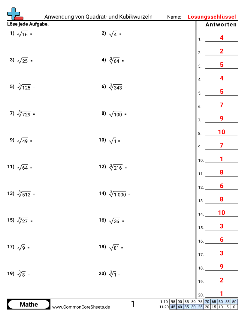 Jedes Arbeitsblatt hat 20 Aufgaben, wo die Quadrat- oder Kubikwurzel einer Zahl ermittelt werden muss. Alle Antworten sind Ganzzahlen.