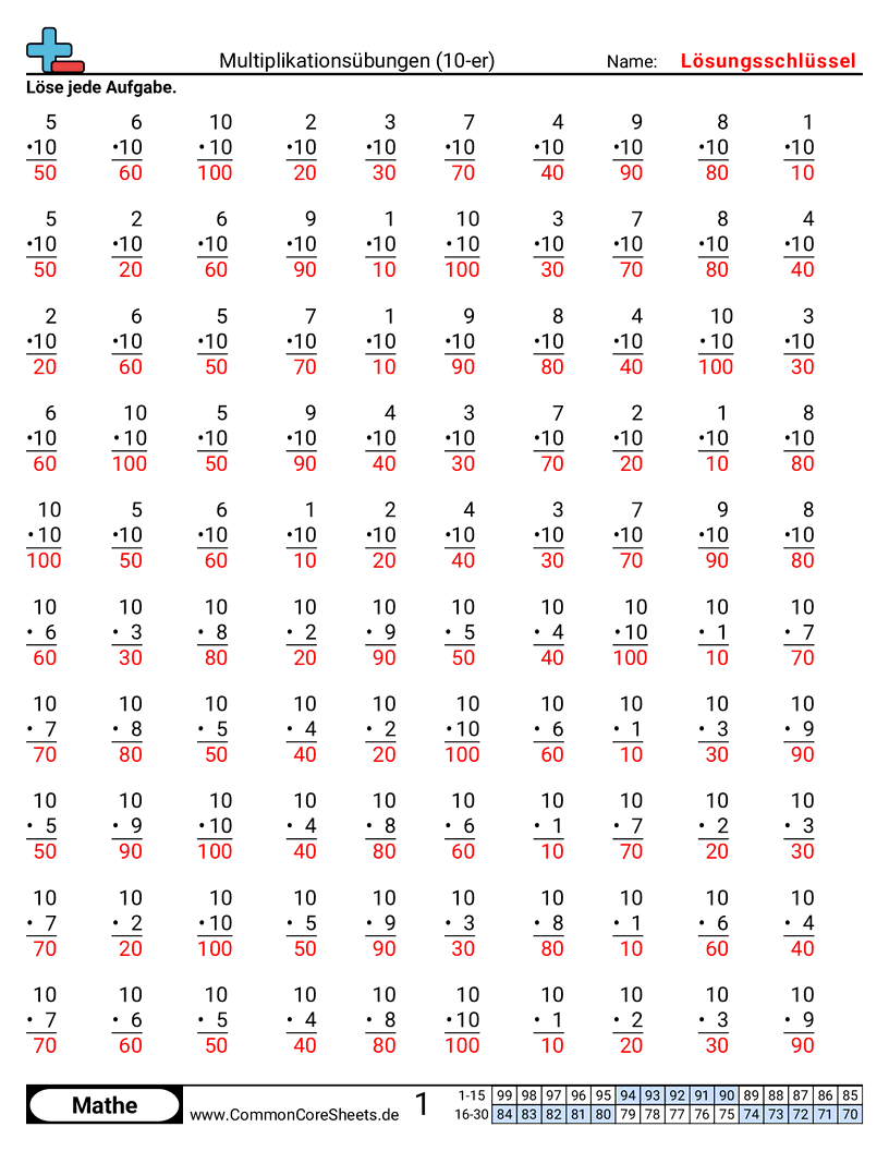 Jedes Arbeitsblatt enthält 100 Aufgaben im Bereich von 1:1 bis zu 10:10.