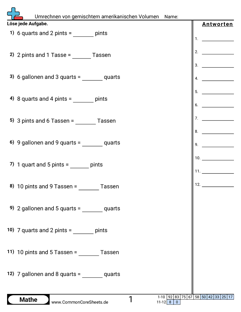 Kostenlose math-Arbeitsblätter zu Umrechnen von gemischtem amerikanischen Volumen. Jedes Arbeitsblatt enthält 12 Aufgaben mit Lösungsschlüssel und ist ideal für Lehrkräfte und Homeschooling. Sie können das PDF herunterladen, Karteikarten erstellen oder es für Online-Lernen nutzen.