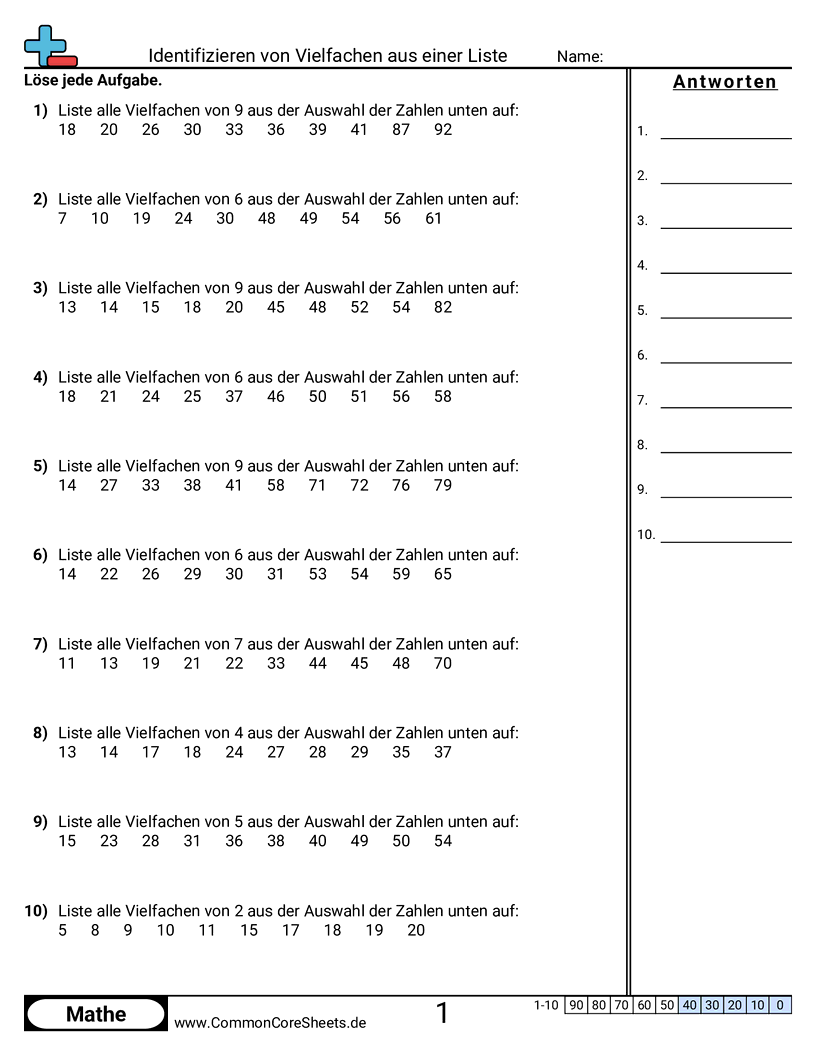 Kostenlose math-Arbeitsblätter für 4. Klasse (4oa4) zu Identifizieren von Vielfachen aus einer Liste. Jedes Arbeitsblatt enthält 10 Aufgaben mit Lösungsschlüssel und ist ideal für Lehrkräfte und Homeschooling. Sie können das PDF herunterladen, Karteikarten erstellen oder es für Online-Lernen nutzen.
