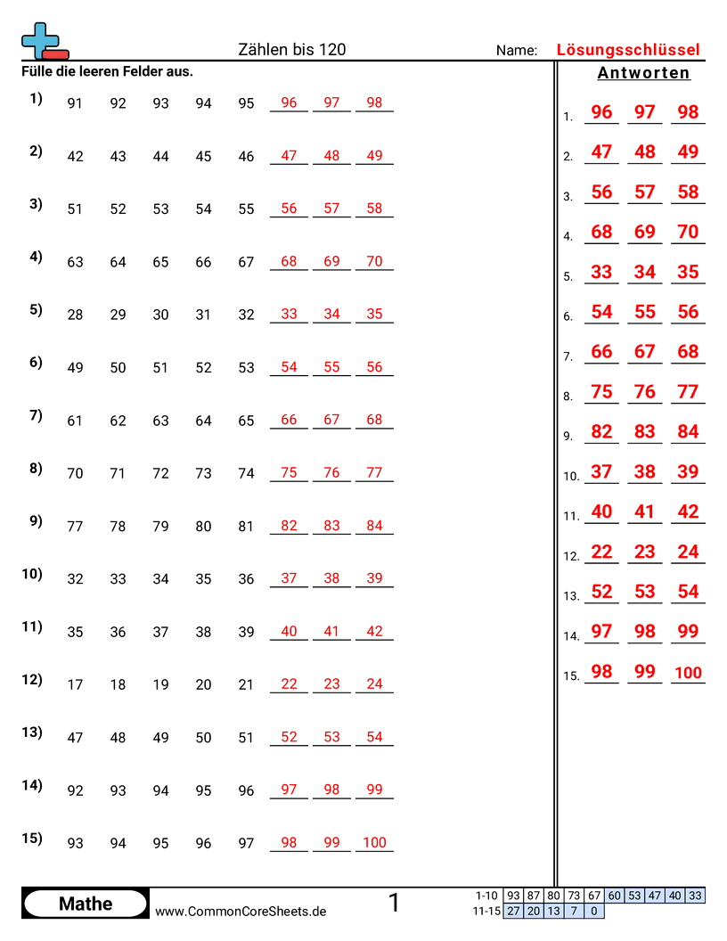 Kostenlose math-Arbeitsblätter für 1. Klasse (1nbt1) zu Zählen bis 120. Jedes Arbeitsblatt enthält 15 Aufgaben mit Lösungsschlüssel und ist ideal für Lehrkräfte und Homeschooling. Sie können das PDF herunterladen, Karteikarten erstellen oder es für Online-Lernen nutzen.