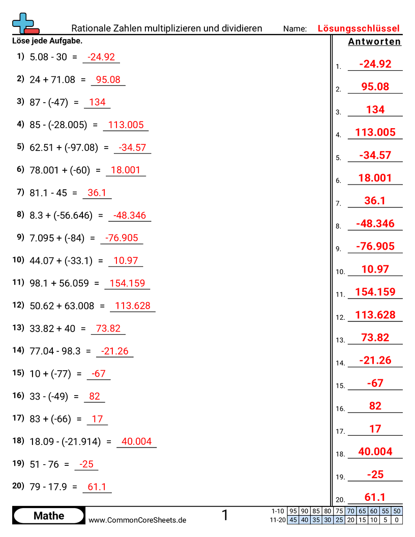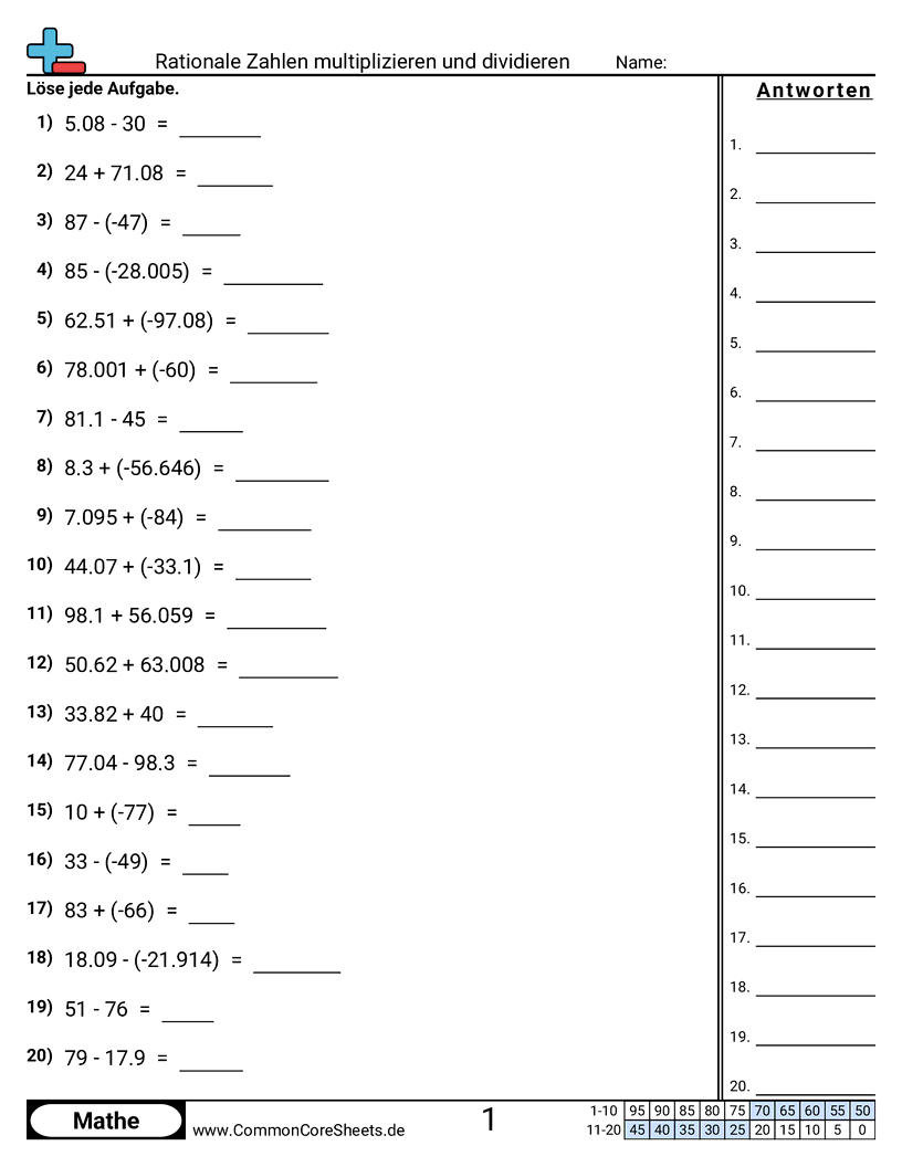 Kostenlose math-Arbeitsblätter für 7. Klasse (7ns1d) zu Rationale Zahlen multiplizieren und dividieren. Jedes Arbeitsblatt enthält 20 Aufgaben mit Lösungsschlüssel und ist ideal für Lehrkräfte und Homeschooling. Sie können das PDF herunterladen, Karteikarten erstellen oder es für Online-Lernen nutzen.