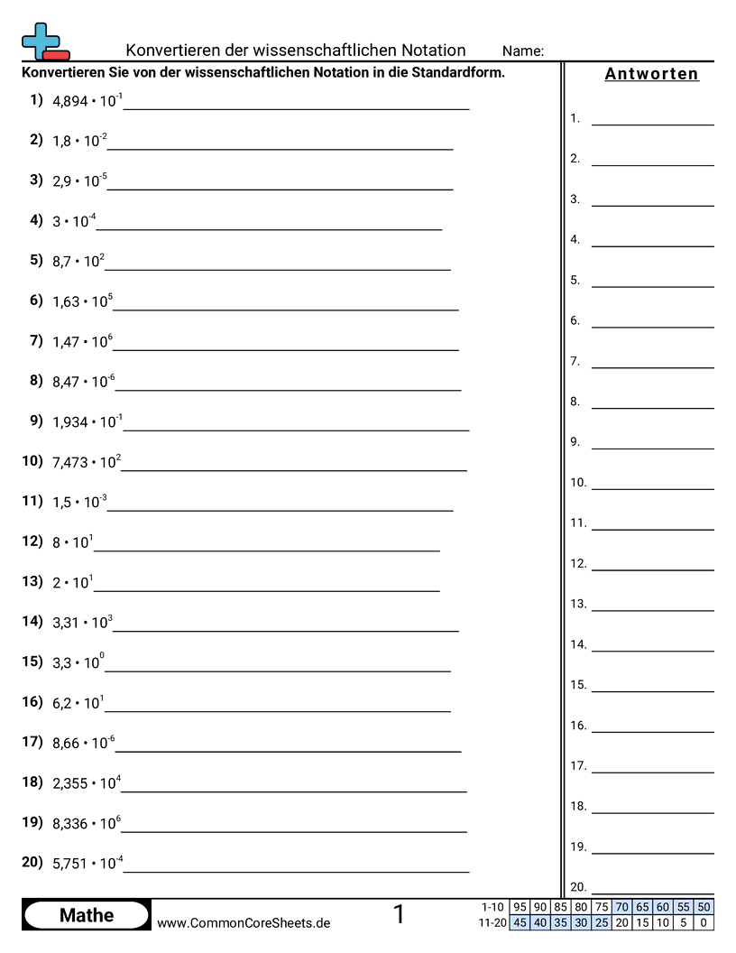 Kostenlose math-Arbeitsblätter zu Konvertieren der wissenschaftlichen Notation. Jedes Arbeitsblatt enthält 20 Aufgaben mit Lösungsschlüssel und ist ideal für Lehrkräfte und Homeschooling. Sie können das PDF herunterladen, Karteikarten erstellen oder es für Online-Lernen nutzen.