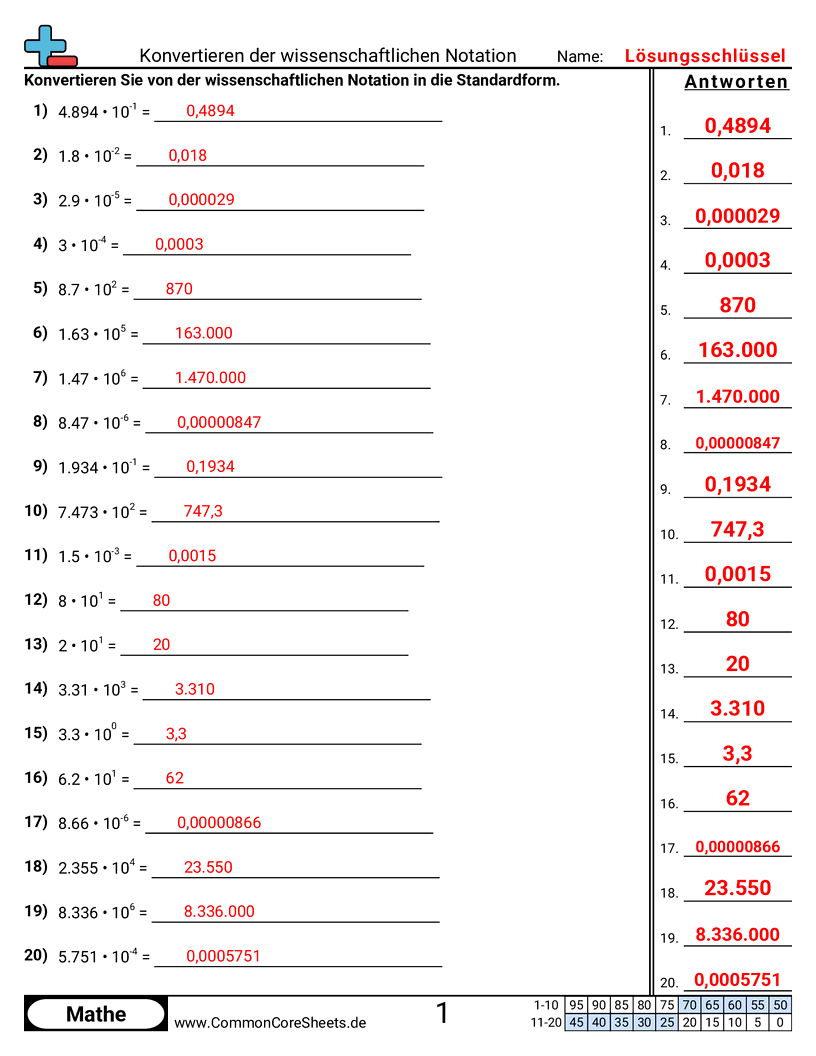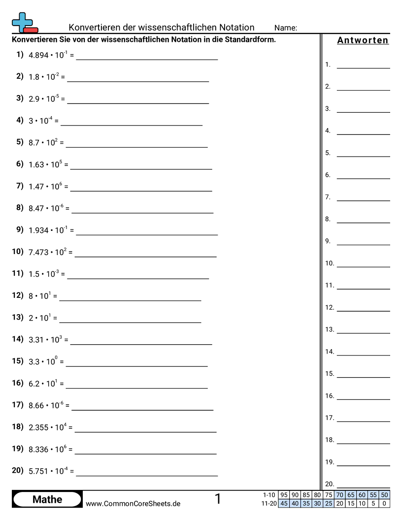 Kostenlose math-Arbeitsblätter zu Konvertieren der wissenschaftlichen Notation. Jedes Arbeitsblatt enthält 20 Aufgaben mit Lösungsschlüssel und ist ideal für Lehrkräfte und Homeschooling. Sie können das PDF herunterladen, Karteikarten erstellen oder es für Online-Lernen nutzen.