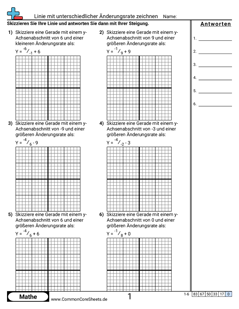 Kostenlose math-Arbeitsblätter für 8. Klasse (8f2) zu Linie mit unterschiedlicher Änderungsrate zeichnen. Jedes Arbeitsblatt enthält 6 Aufgaben mit Lösungsschlüssel und ist ideal für Lehrkräfte und Homeschooling. Sie können das PDF herunterladen, Karteikarten erstellen oder es für Online-Lernen nutzen.