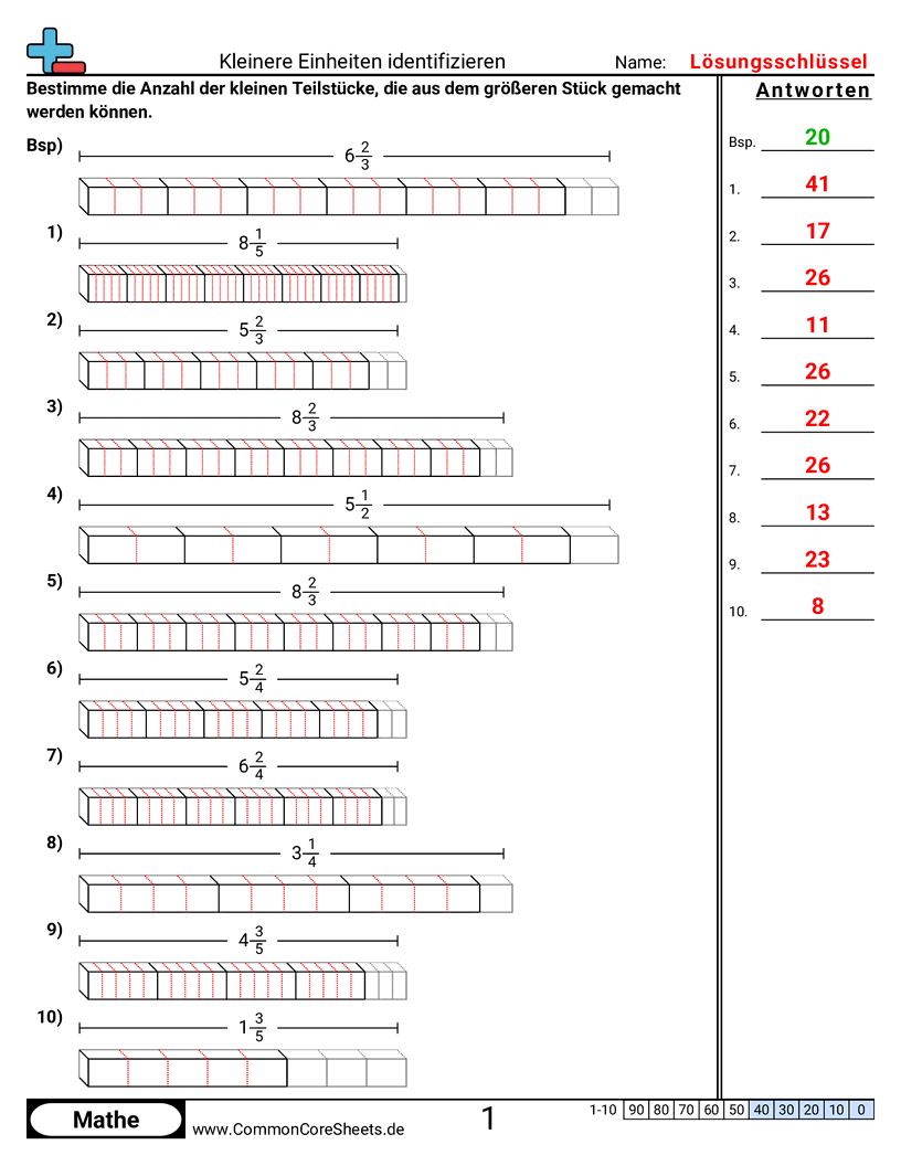 Jedes Arbeitsblatt hat 10 Aufgaben, wo eine größere Einheit in kleinere Einheiten aufgeteilt wird.