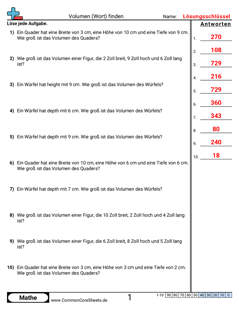 Kostenlose math-Arbeitsblätter zu Volumen (Wort) finden. Jedes Arbeitsblatt enthält 10 Aufgaben mit Lösungsschlüssel und ist ideal für Lehrkräfte und Homeschooling. Sie können das PDF herunterladen, Karteikarten erstellen oder es für Online-Lernen nutzen.
