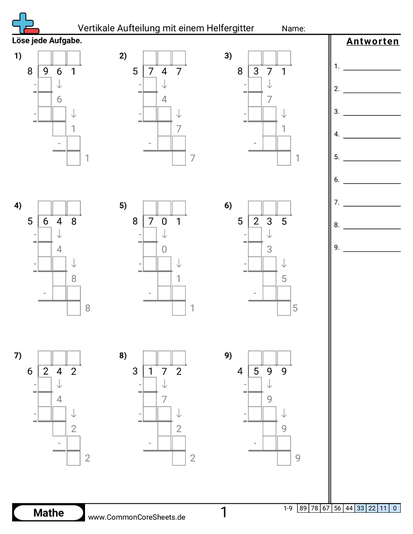 Kostenlose math-Arbeitsblätter für 6. Klasse (6ns2) zu Vertikale Aufteilung mit einem Helfergitter. Jedes Arbeitsblatt enthält 9 Aufgaben mit Lösungsschlüssel und ist ideal für Lehrkräfte und Homeschooling. Sie können das PDF herunterladen, Karteikarten erstellen oder es für Online-Lernen nutzen.