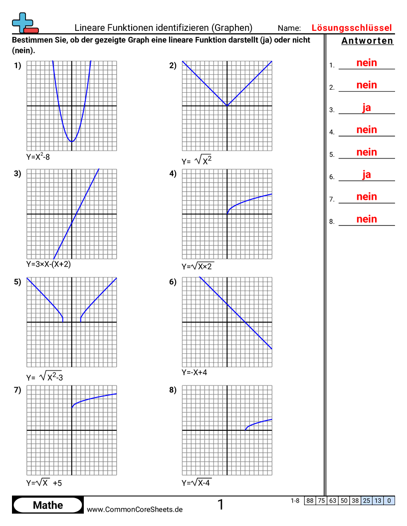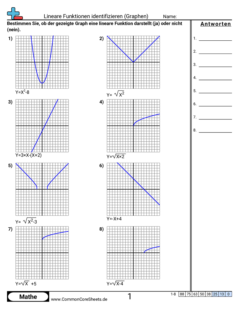 Kostenlose math-Arbeitsblätter für 8. Klasse (8f3) zu Lineare Funktionen identifizieren (Graphen). Jedes Arbeitsblatt enthält 8 Aufgaben mit Lösungsschlüssel und ist ideal für Lehrkräfte und Homeschooling. Sie können das PDF herunterladen, Karteikarten erstellen oder es für Online-Lernen nutzen.