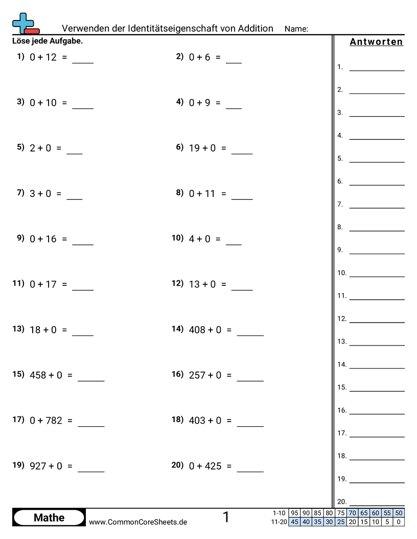 Kostenlose math-Arbeitsblätter zu Verwenden der Identitätseigenschaft von Addition. Jedes Arbeitsblatt enthält 20 Aufgaben mit Lösungsschlüssel und ist ideal für Lehrkräfte und Homeschooling. Sie können das PDF herunterladen, Karteikarten erstellen oder es für Online-Lernen nutzen.