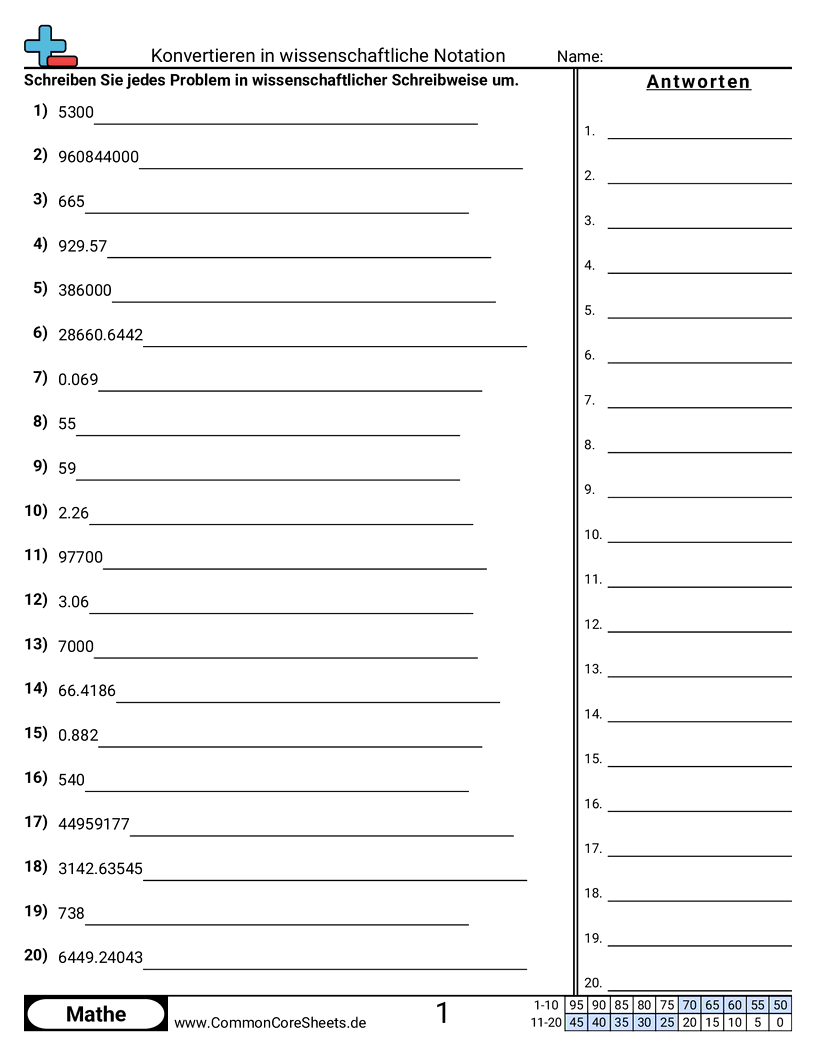 Kostenlose math-Arbeitsblätter für 8. Klasse (8ee4) zu Konvertieren in wissenschaftliche Notation. Jedes Arbeitsblatt enthält 20 Aufgaben mit Lösungsschlüssel und ist ideal für Lehrkräfte und Homeschooling. Sie können das PDF herunterladen, Karteikarten erstellen oder es für Online-Lernen nutzen.