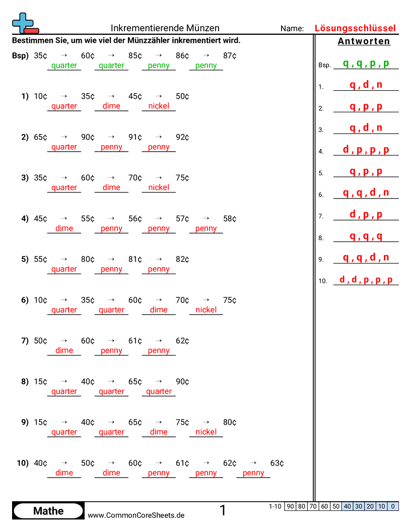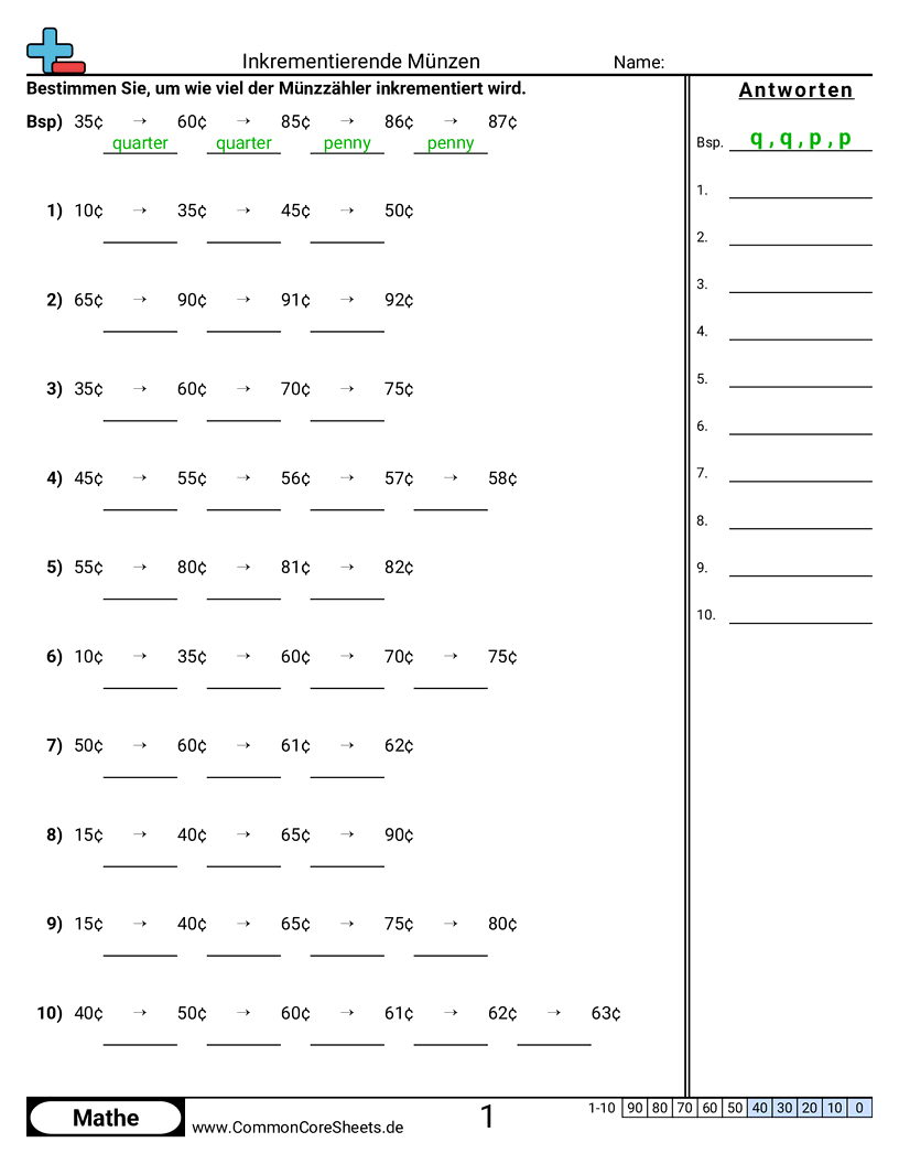 Kostenlose math-Arbeitsblätter zu Inkrementierende Münzen. Jedes Arbeitsblatt enthält 10 Aufgaben mit Lösungsschlüssel und ist ideal für Lehrkräfte und Homeschooling. Sie können das PDF herunterladen, Karteikarten erstellen oder es für Online-Lernen nutzen.