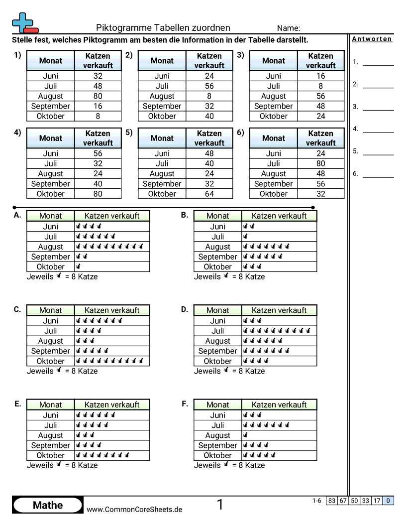 Jedes Arbeitsblatt hat 6 Aufgaben, wo festzustellen ist, welches Piktogramm zu einer entsprechenden Tabelle gehört.