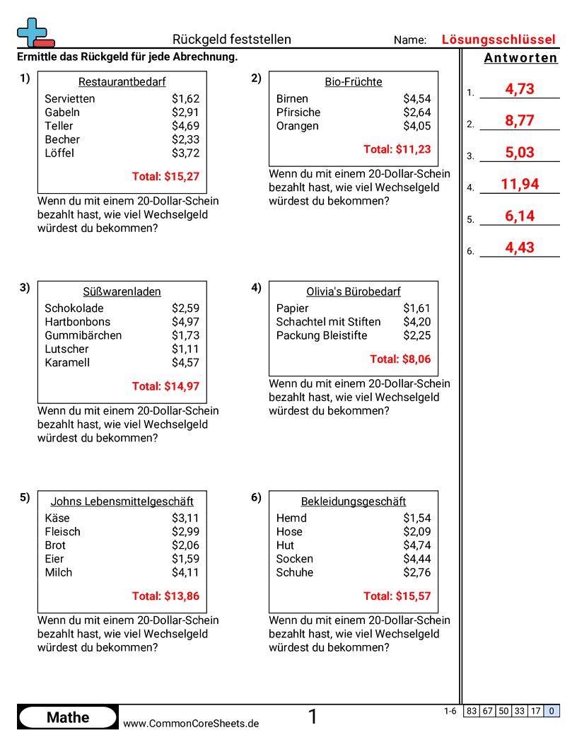 Jedes Arbeitsblatt hat 6 Aufgaben, wo das Rückgeld anhand einer Abrechnung zu bestimmen ist.