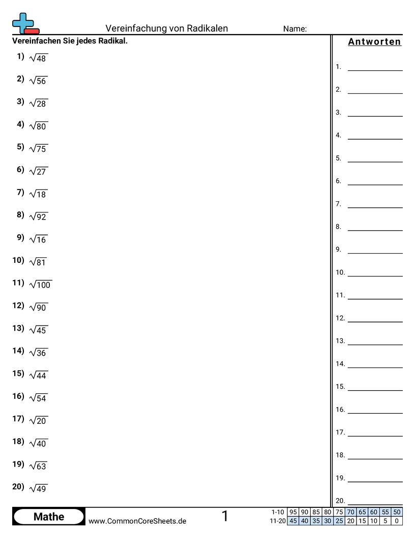 Kostenlose math-Arbeitsblätter für 8. Klasse (8ns2) zu Vereinfachung von Radikalen. Jedes Arbeitsblatt enthält 20 Aufgaben mit Lösungsschlüssel und ist ideal für Lehrkräfte und Homeschooling. Sie können das PDF herunterladen, Karteikarten erstellen oder es für Online-Lernen nutzen.